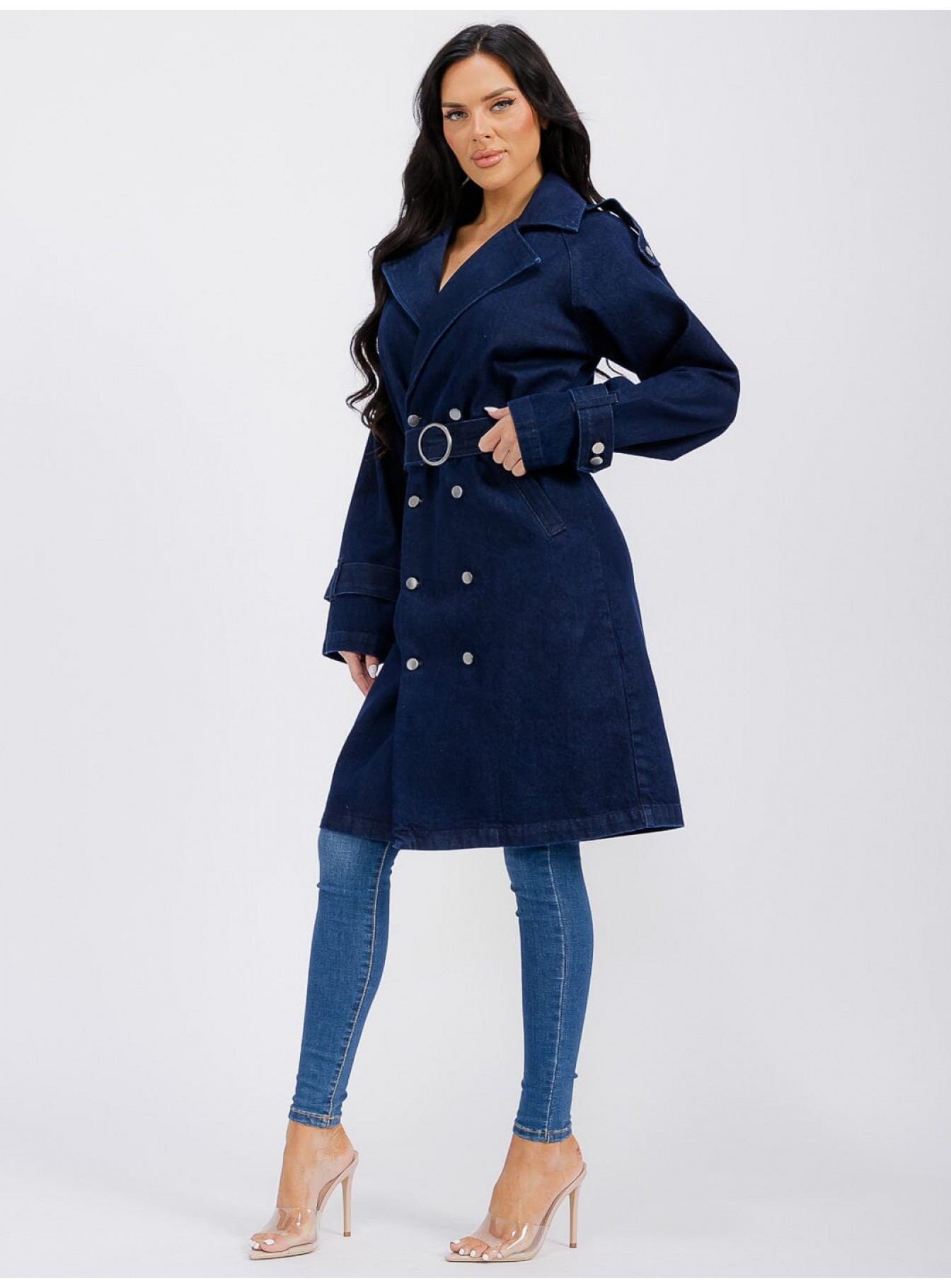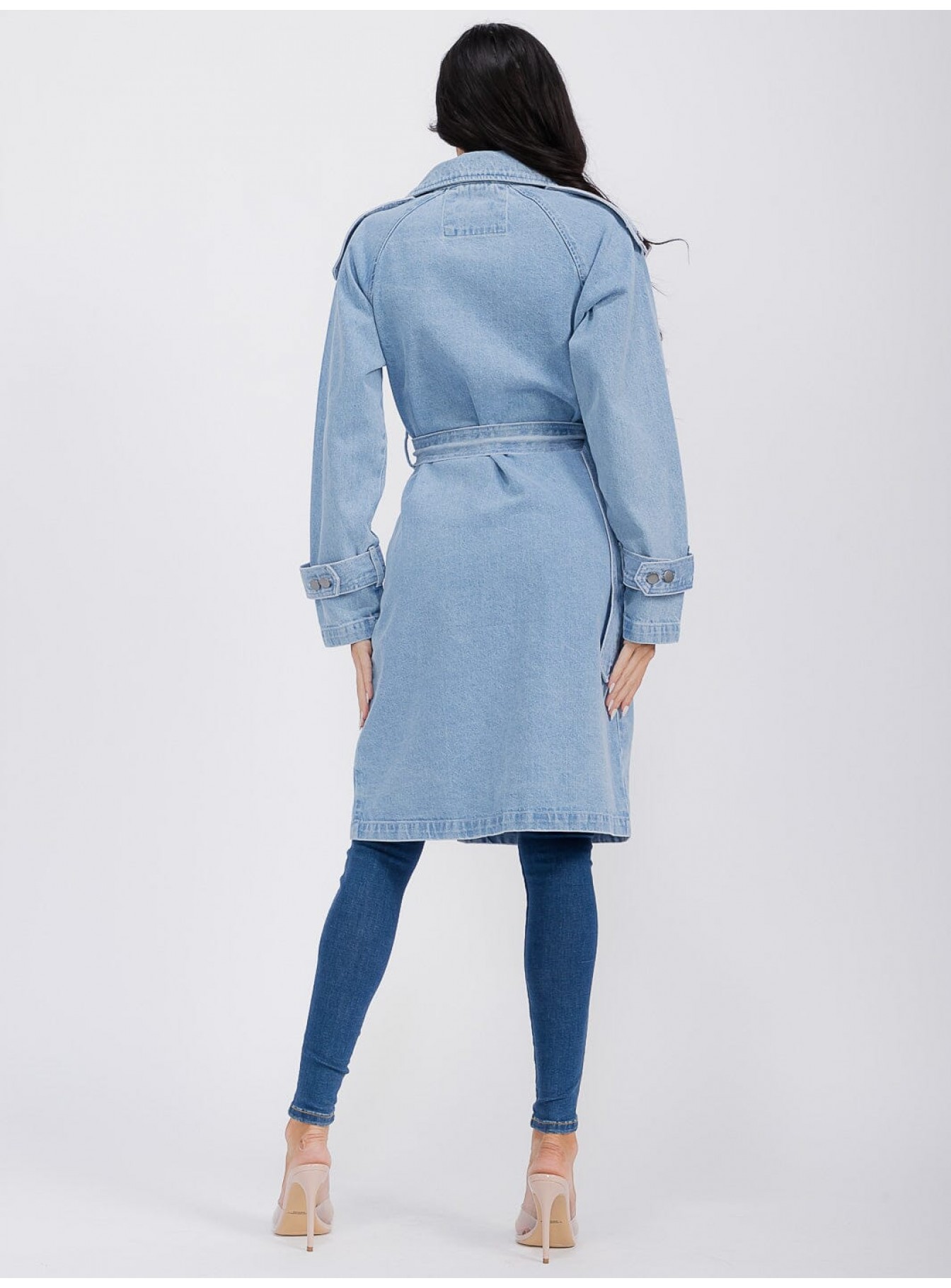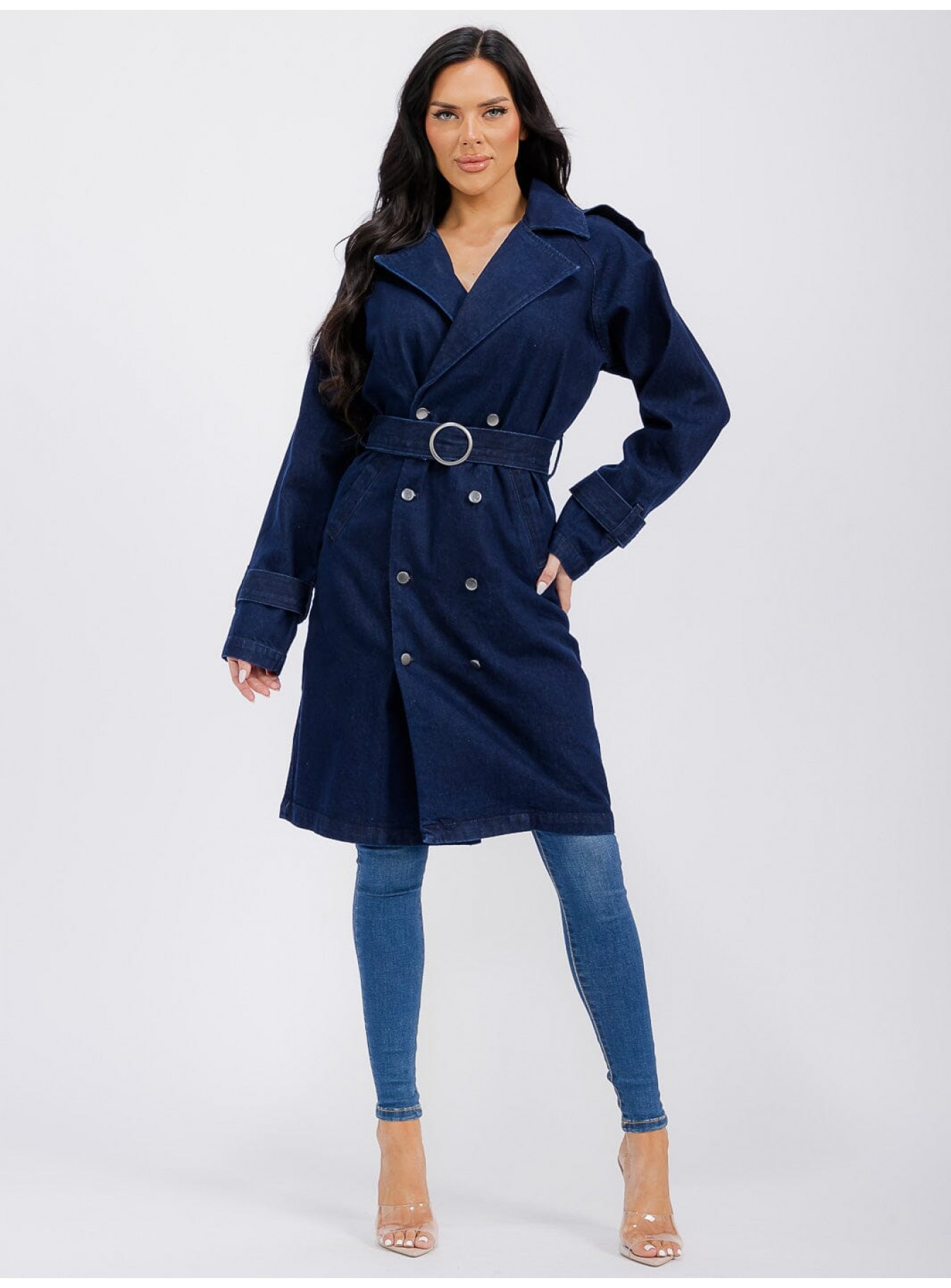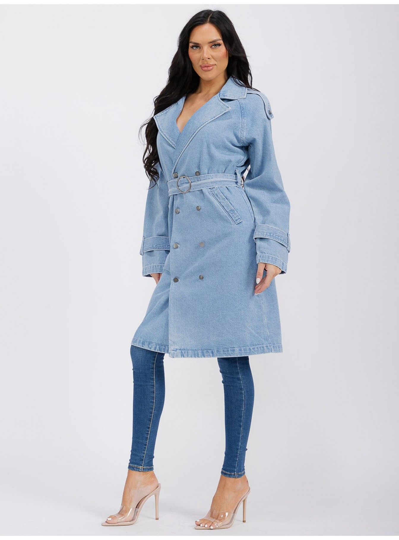 The women's belted denim coat with long sleeves is a versatile addition to any boutique's collection. Crafted from 100% cotton, this denim coat features a button closure and front pockets, making it a practical choice for cooler seasons. It's perfect for layering over casual outfits or styling up for a trendy, urban look, making it a must-have for retailers seeking trend-forward outerwear.