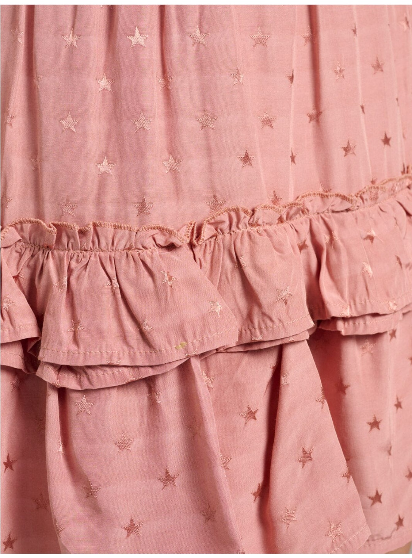 Features:Lightweight fabric, elastic waistband for comfort, playful star print design, tiered ruffle silhouette, versatile styling options, popular with boutiques, easy to layer.