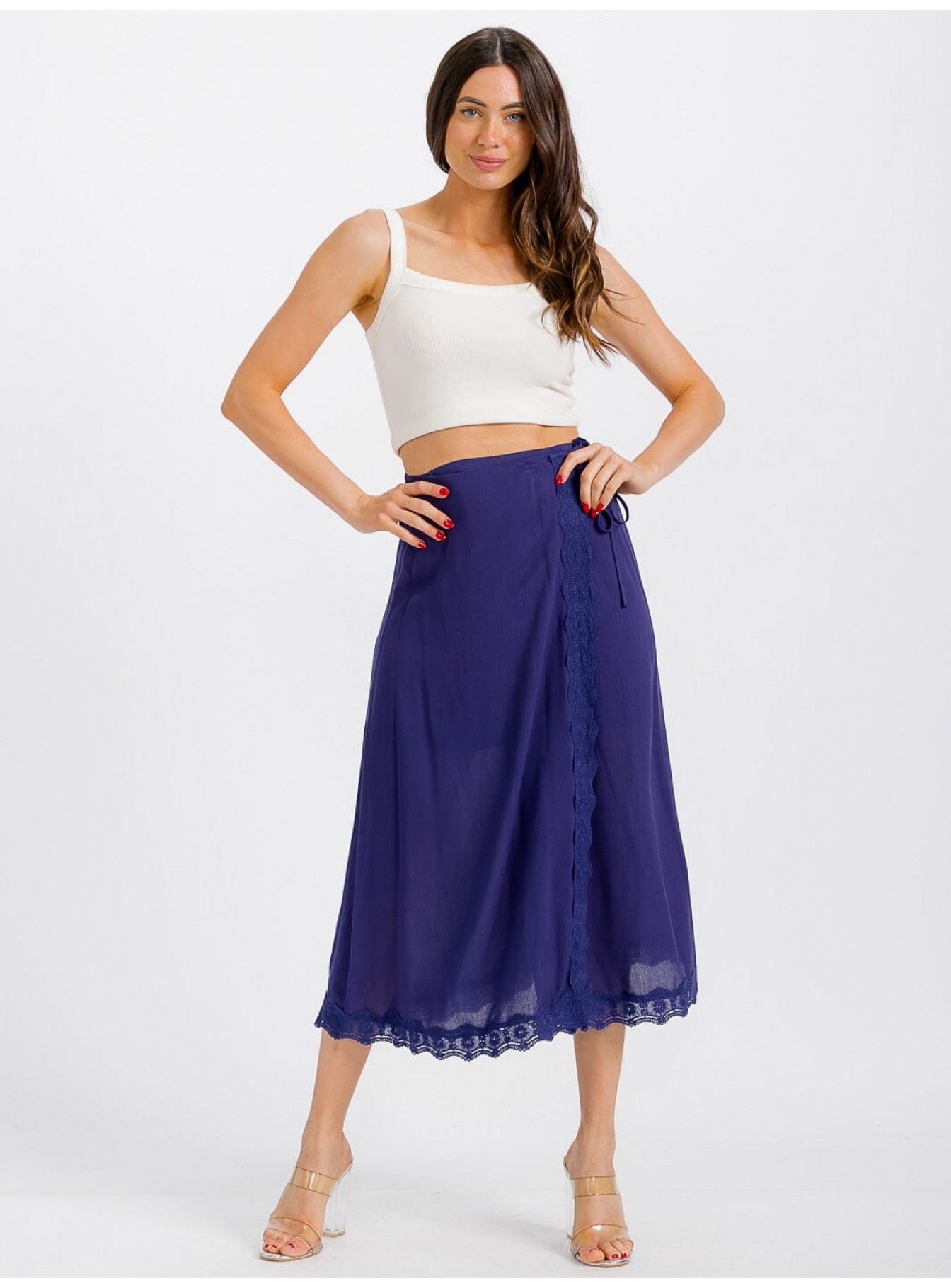 Discover the elegance of our women’s midi-length wrap skirt featuring intricate self-tie and crochet trim details. Crafted from soft, breathable rayon, this skirt offers a flattering silhouette perfect for both casual and sophisticated occasions. A must-have for retailers, it's a bestseller with boutiques looking for trend-forward layering pieces that appeal to a wide range of customers.