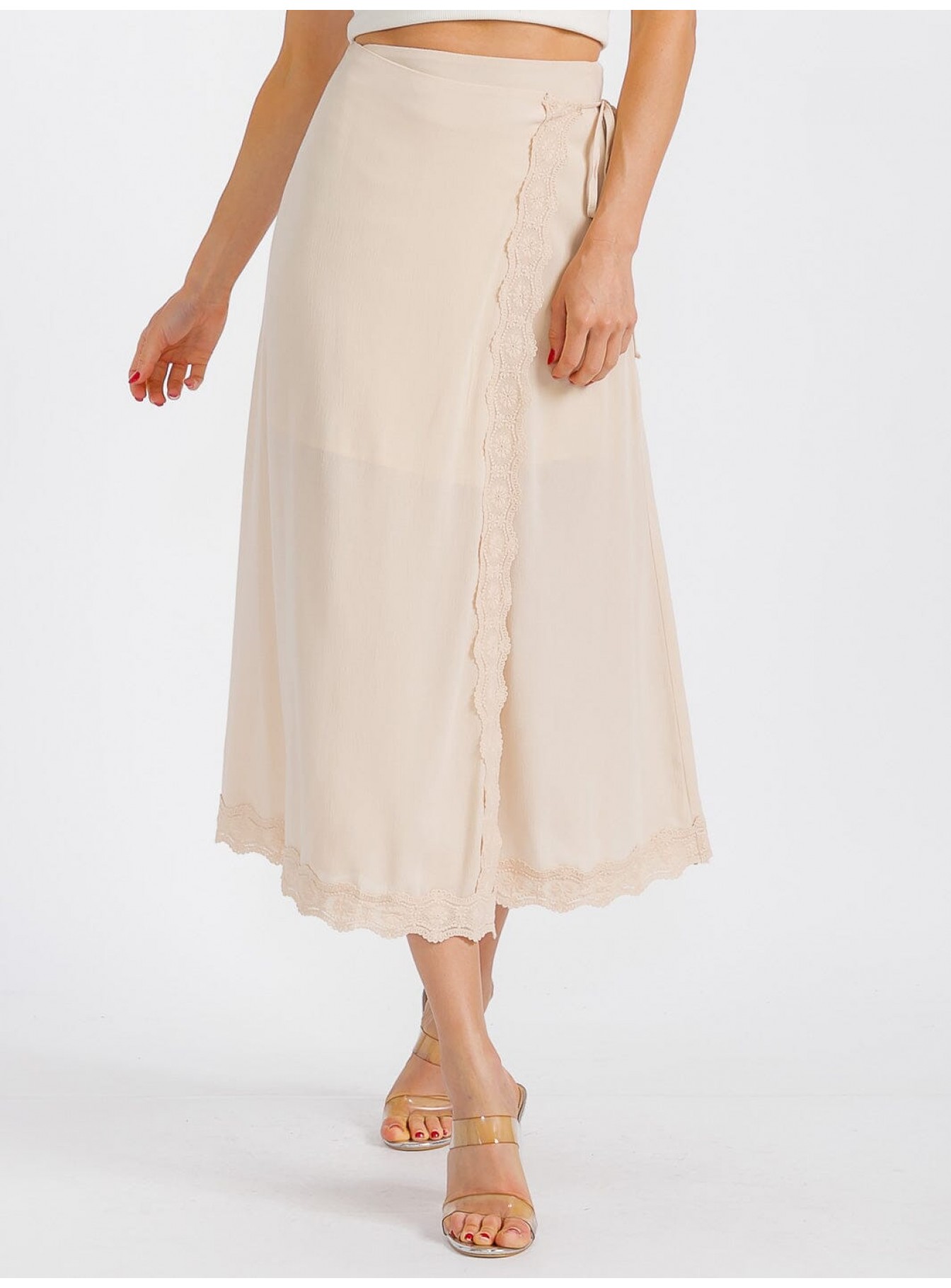 WOMEN'S SELF TIE CROCHET TRIM DETAILED WRAP MIDI SKIRT