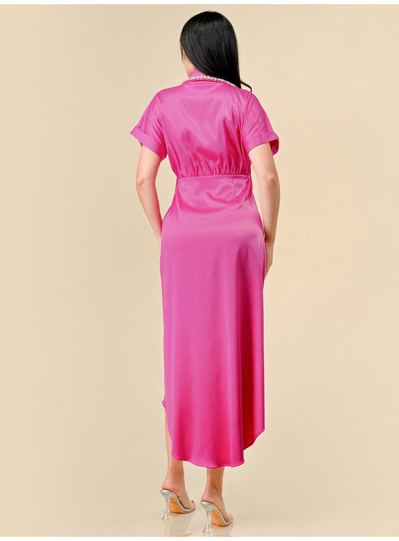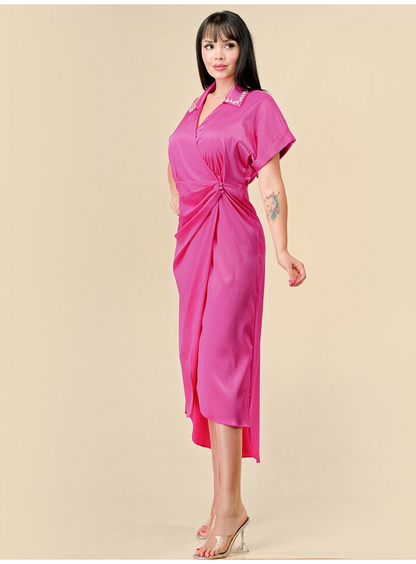 • Product Code: WOMEN'S SHORT SLEEVES STUDS NECK DETAILED HIGH-LOW WRAP MIDI DRE