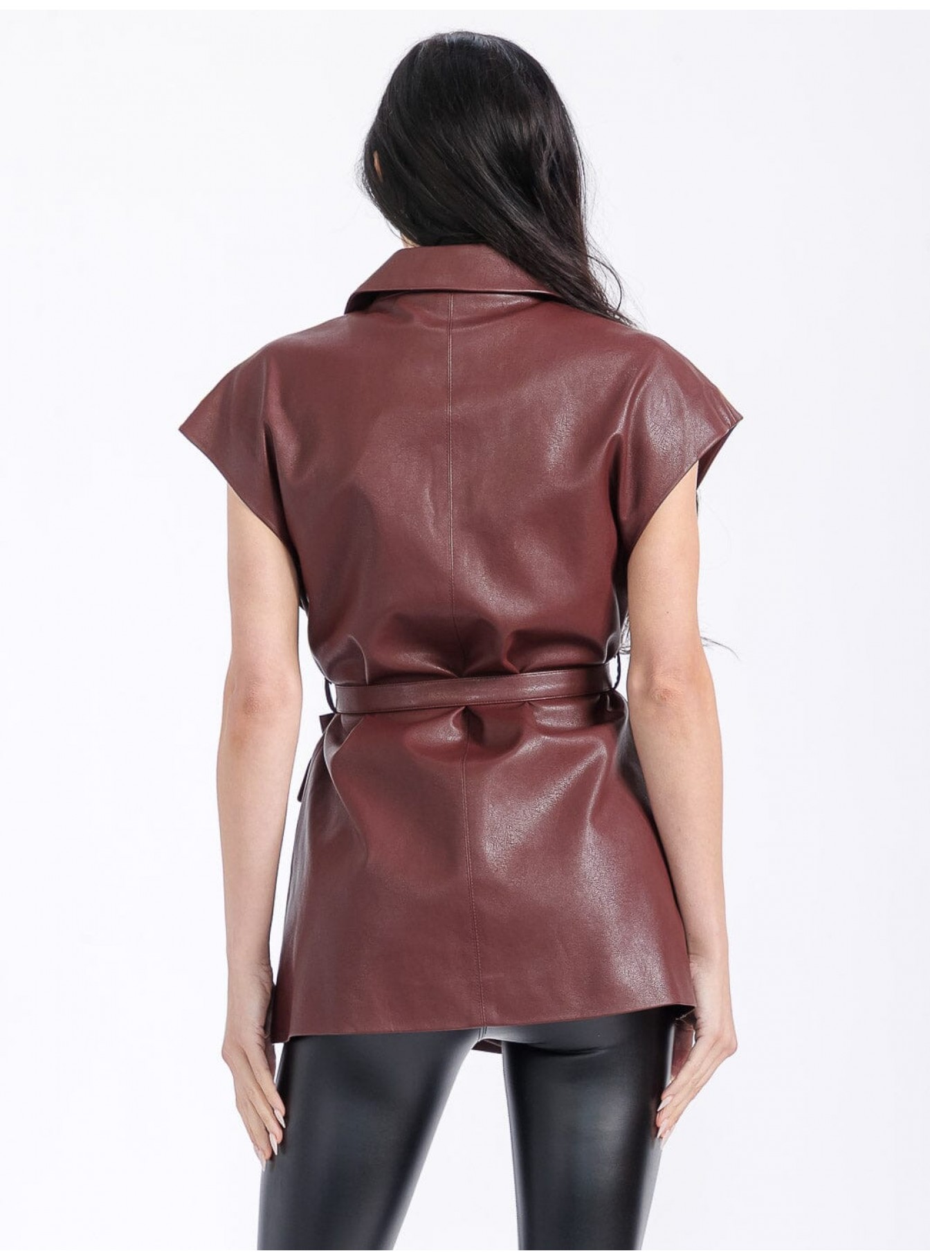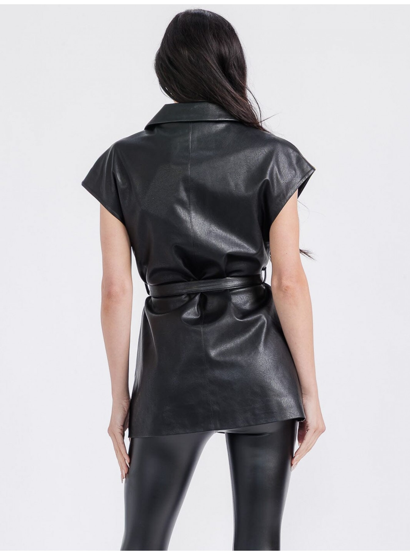 WOMEN'S SLEEVELESS BUTTON CLOSURE SELF TIE FRONT POCKETS PU PLEATHER VEST