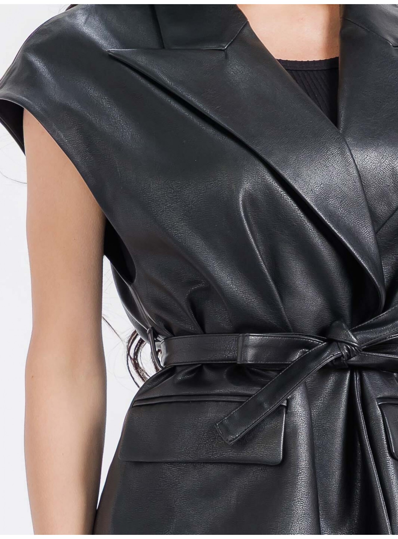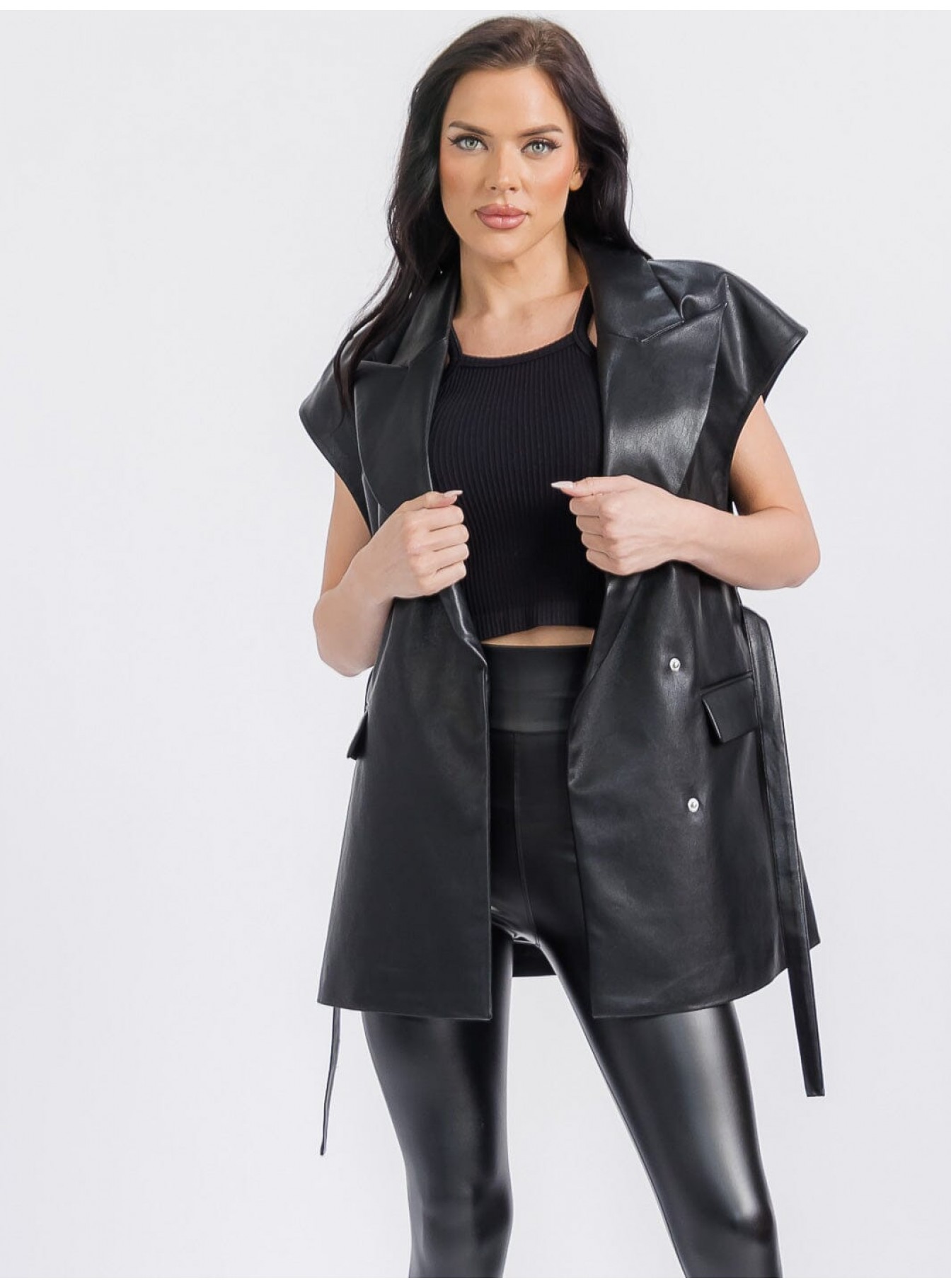 Features:Luxurious PU pleather, flattering sleeveless design, adjustable self-tie for a custom fit, functional front pockets, perfect for layering, suitable for multi-season wear, popular with fashion-forward boutiques.