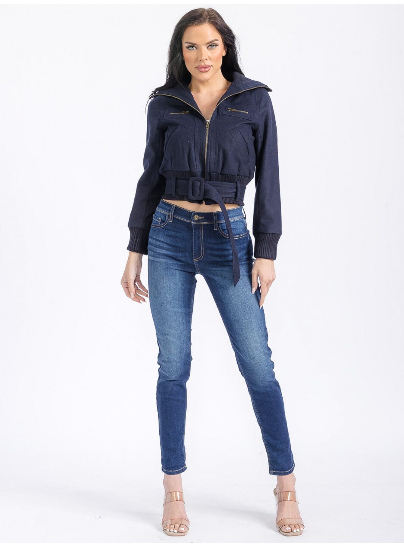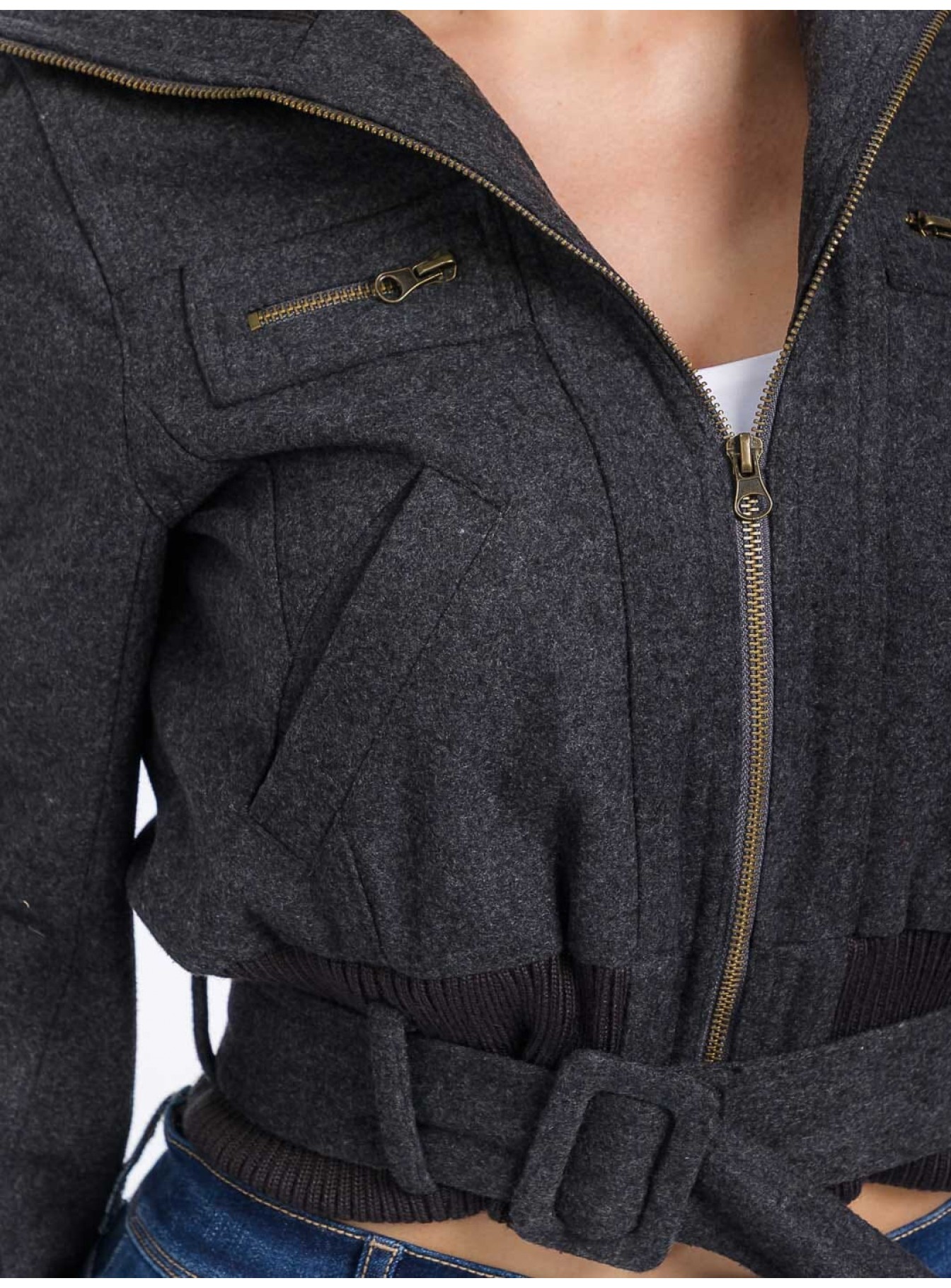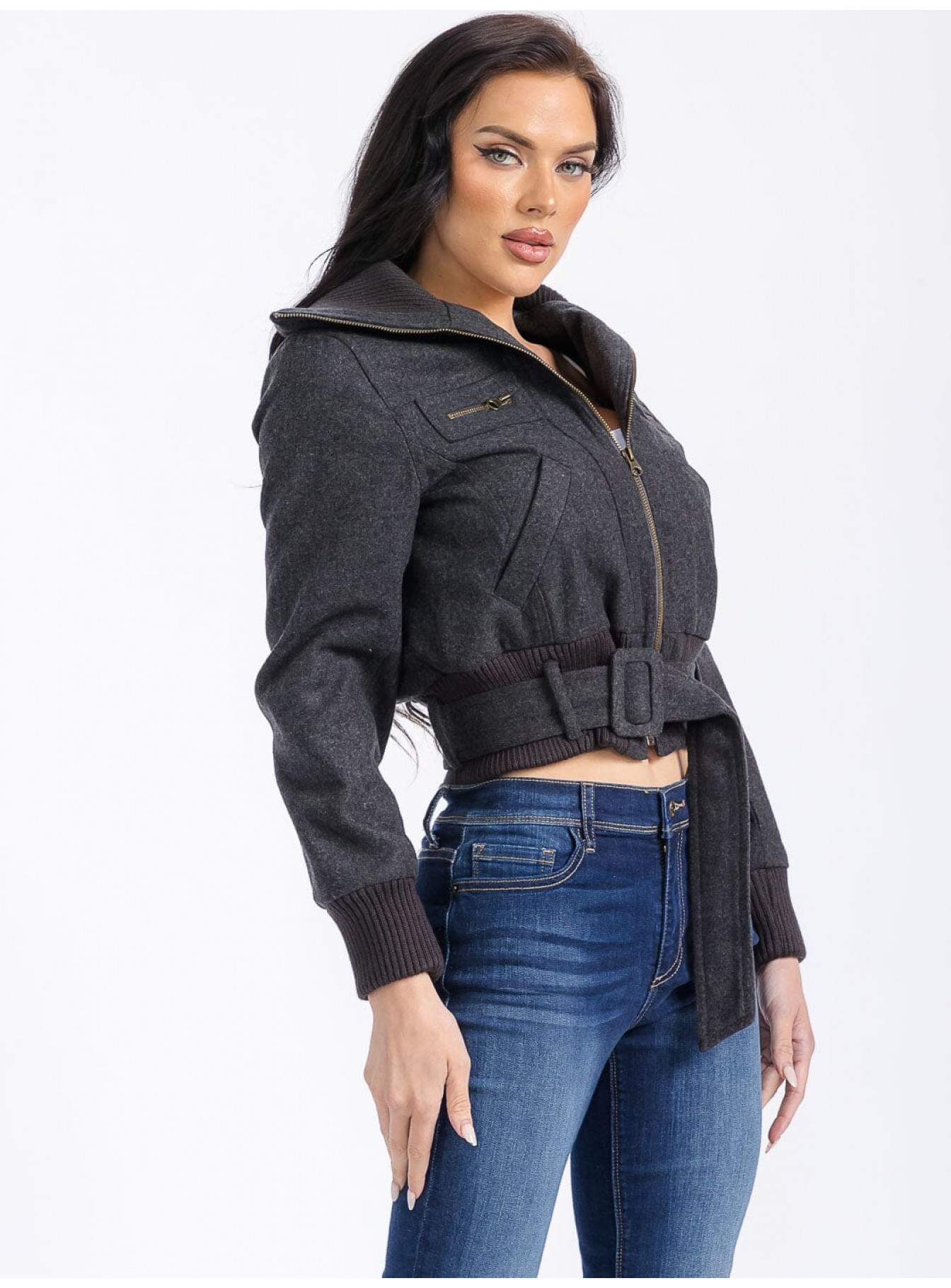 WOMEN'S LONG SLEEVE ZIPPER CLOSURE POCKETS BELTED JACKET