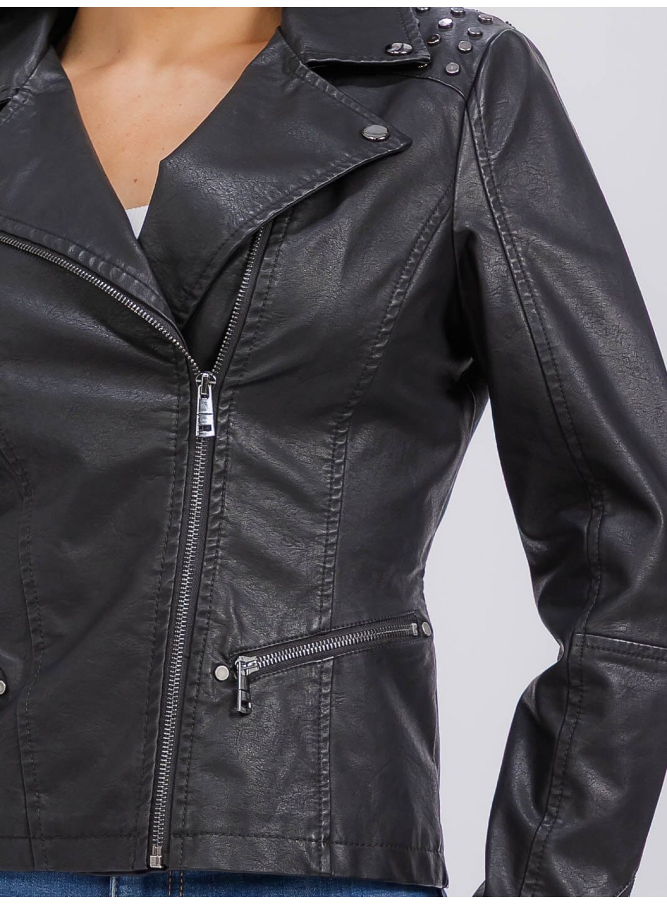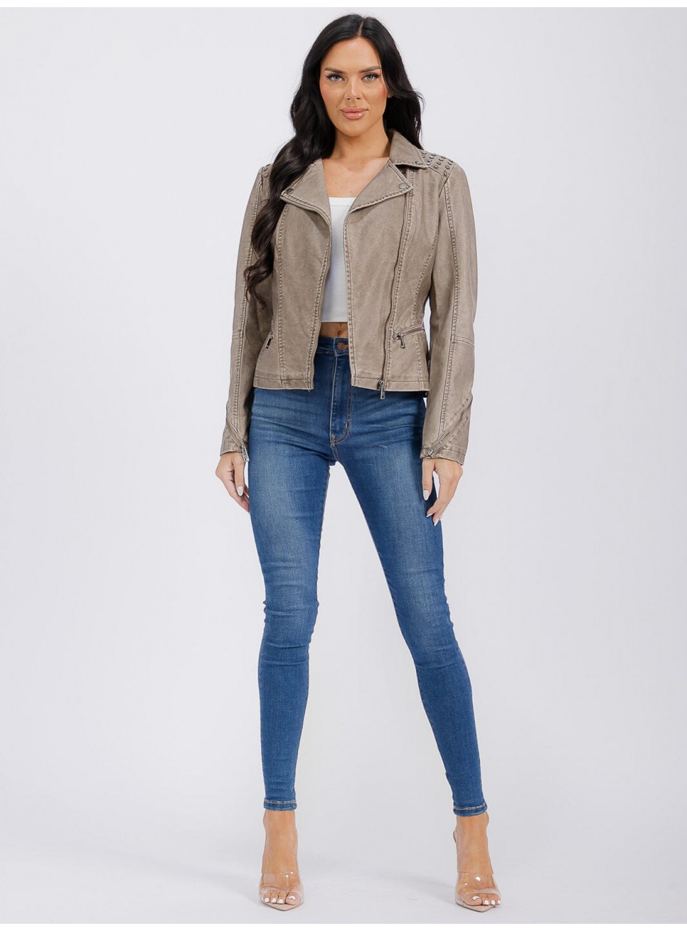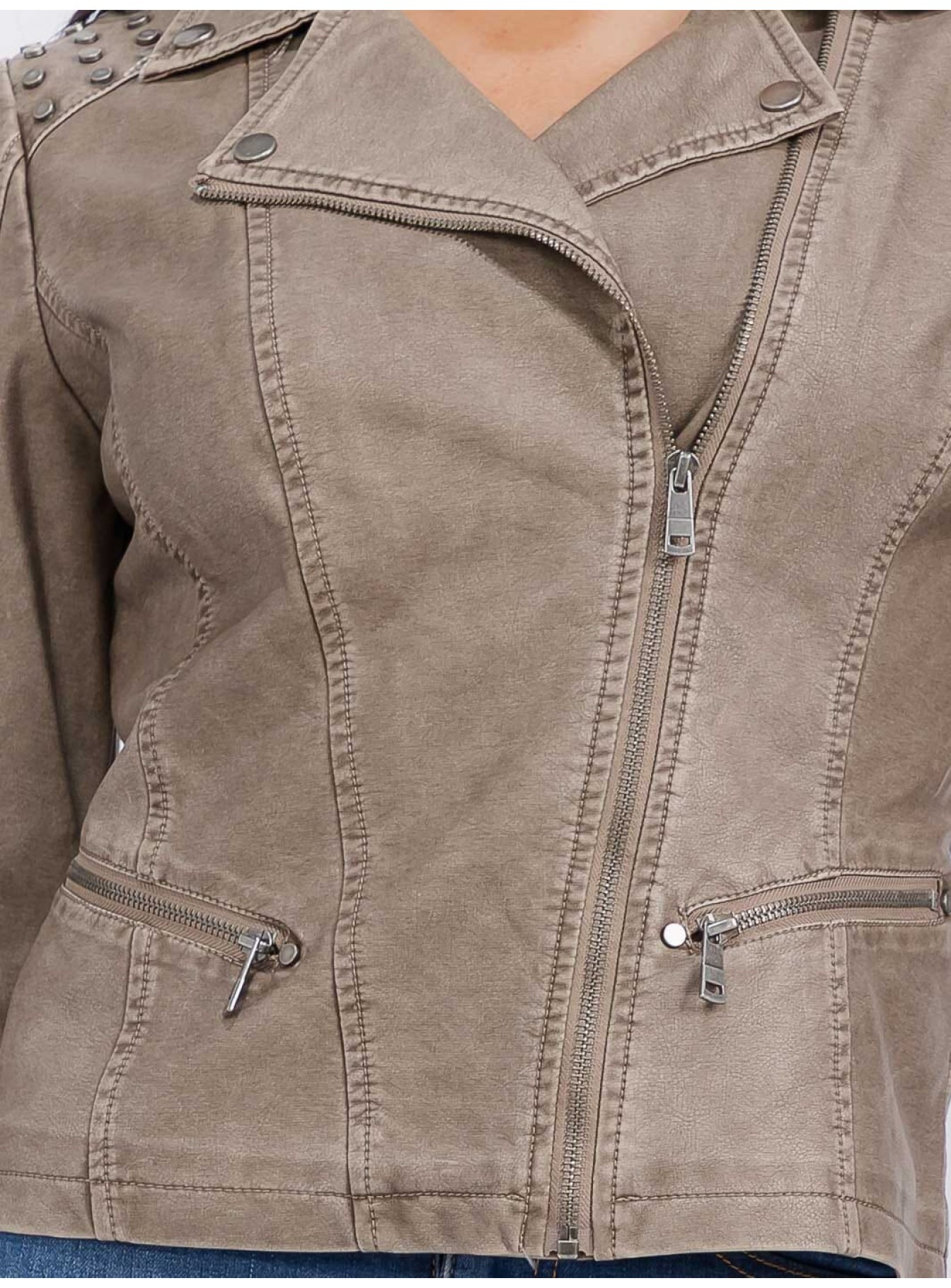 WOMEN'S LONG SLEEVE ZIPPER CLOSURE FRONT POCKETS STUDS PU PLEATHER JACKET