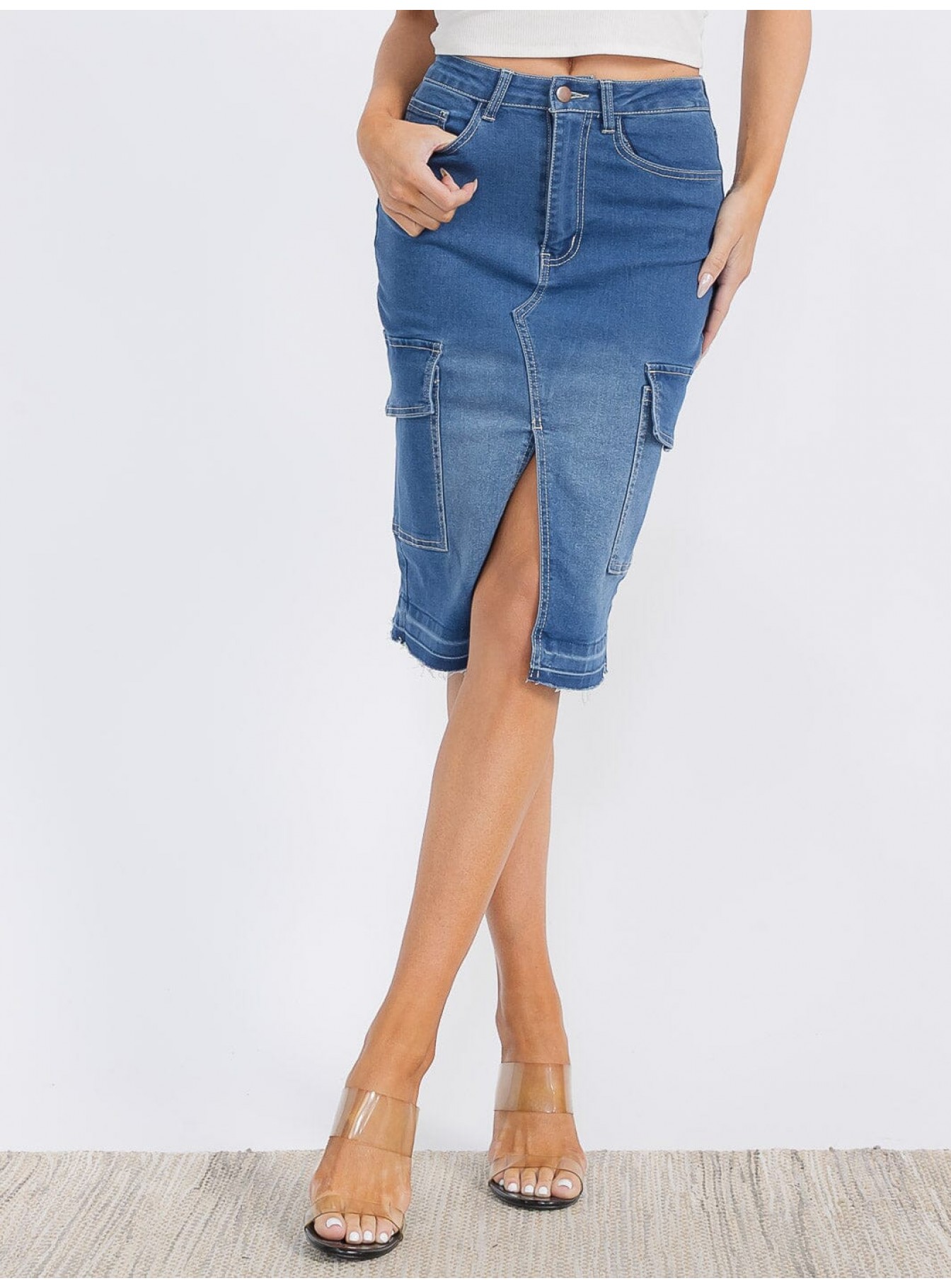 WOMEN'S BUTTON CLOSURE FRONT SLIT CARGO POCKETS WASHED DENIM MIDI SKIRT